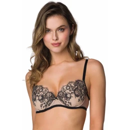 Zvodná push-up podprsenka Frances v béžovej a čiernej farbe. čierne košíčky podšité béžovou bavlnou s vyberateľnými push-up vložkami. elastické sieťované boky. mašľa uprostred. nastaviteľné ramienka bez ramienok. dvojité zapínanie na háčiky s trojcestným nastavením.