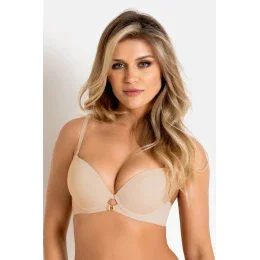 Biustonosz NELA Push-Up 19241 od marki Mediolano w kolorze beżowym to nowoczesna bielizna o minimalistycznym, a zarazem kobiecym designie. Wykonany z wysokiej jakości materiałów, idealnie dopasowuje się do ciała i zapewnia komfort przez cały dzień. Gładkie, formowane miseczki typu push-up pięknie modelują i unoszą biust, nadając mu pełny, naturalny kształt. Model wyposażony jest w regulowane ramiączka i klasyczne zapięcie na haftkę, co pozwala na indywidualne dopasowanie. Eleganckim detalem są złote pierścienie między miseczkami, które dodają bieliźnie nowoczesnego charakteru. Neutralny odcień beżu sprawia, że biustonosz pozostaje niewidoczny pod jasnymi i obcisłymi ubraniami.
