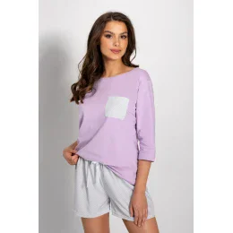 Dámske pyžamo pozostávajúce z blúzky a šortiek. Blúzka s 3/4 rukávmi, s vreckom na prednej strane. Šortky s elastickým pásom a ozdobnou mašľou.