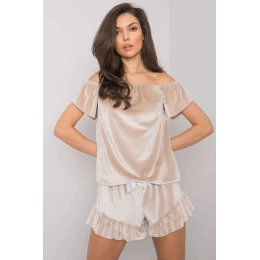 Dámske velúrové pyžamo originálneho strihu. Pyžamo pozostávajúce z blúzky a šortiek. Blúzka so španielskym výstrihom a krátkymi rukávmi. Šortky s elastickým pásom, ozdobnou mašľou a ozdobným volánikom v spodnej časti.