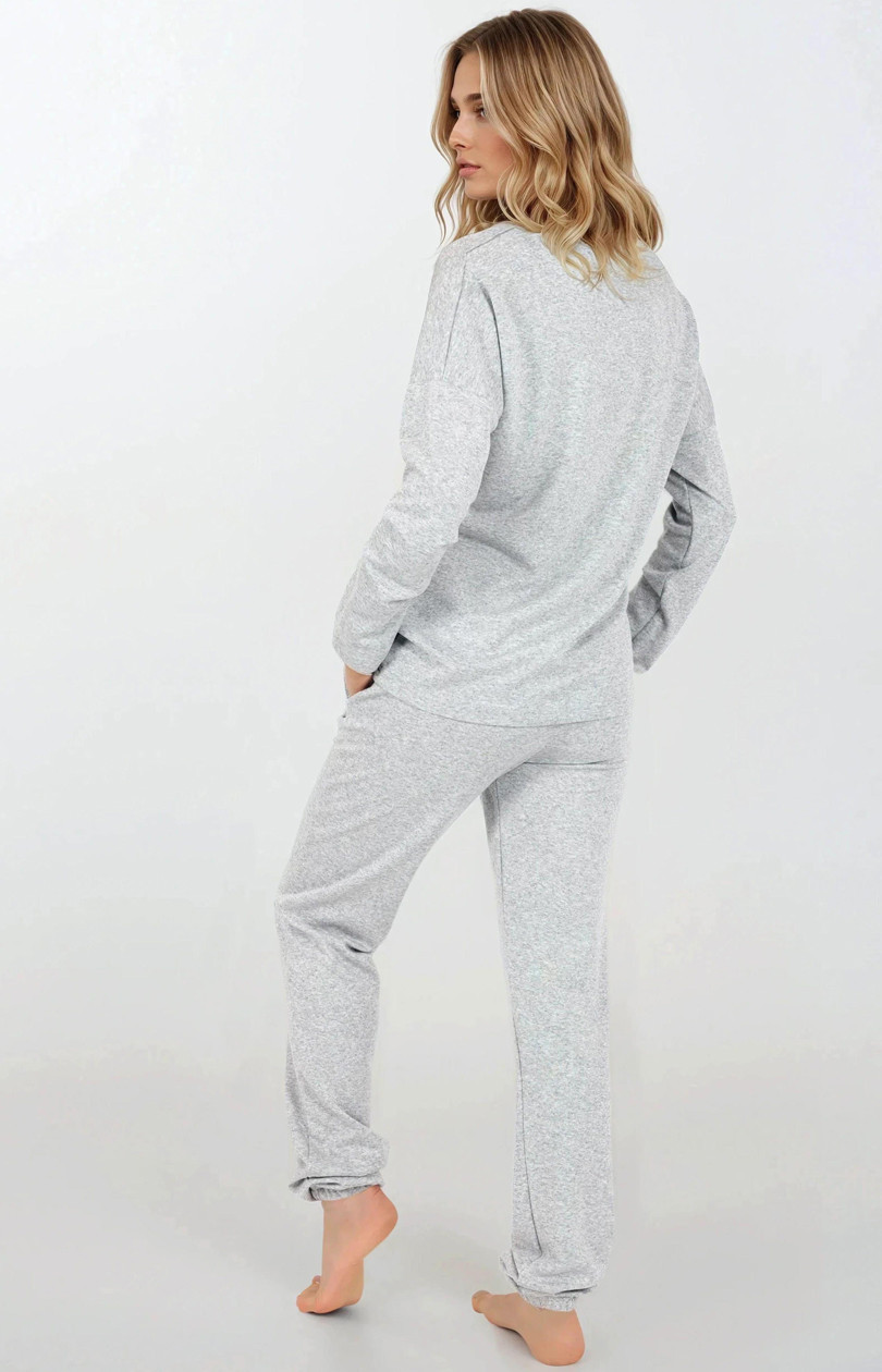 Dámsky pyžamový set, ktorý spája štýlový dizajn s pohodlím, ideálny ako na spanie, tak aj ako elegantný domáci odev. Tričko s dlhým rukávom, V výstrihom zdobeným jemným lemom, bolo navrhnuté vo voľnom oversized strihu, čo zaručuje pohodlie a voľnosť pohybu. Nohavice s pravidelným strihom a dlhými nohavicami s elastickými manžetami dodávajú celému outfitu moderný charakter. Guma v páse zaisťuje perfektné priliehanie. Celý set je vyrobený z priedušnej elastickej látky s jemným leskom, ktorá nielen krásne vyzerá, ale tiež zaisťuje maximálne pohodlie nosenia. Poľský výrobok, vytvorený s dôrazom na detaily a vysokú kvalitu spracovania, je skvelou voľbou pre ženy, ktoré ocenia spojenie pohodlia s eleganciou. Ideálne na každé ročné obdobie.