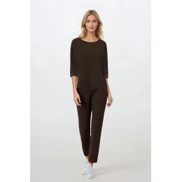 Toto dvojdielne pyžamo spája ženský štýl s pohodlím a eleganciou, je ideálne na večerné vychádzky aj na domáce nosenie. 3/4 rukávy trička s výstrihom do U vytvárajú jemnú, ale ženskú siluetu a manžetové rukávy dodávajú klasický charakter. Pyžamo je vyrobené z mäkkej a priedušnej tkaniny, je hypoalergénne a má certifikát OEKO-TEX Standard 100, čo zaručuje, že je bezpečné pre pokožku. Úzke nohavice s dlhými nohavicami a elastickým pásom sa dokonale prispôsobia postave a absencia vreciek a minimalistický strih mu dodávajú ľahkosť. Výrobok je 100 % vyrobený z prírodných materiálov a navrhnutý a ušitý v Poľsku, čo zaručuje najvyššiu kvalitu spracovania.