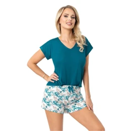 Dámsky pyžamový komplet z jemnej viskózy je mimoriadne pohodlná súprava ideálna na teplé noci. Skladá sa z ľahkého topu s krátkymi rukávmi a ženským výstrihom do V a krátkych nohavíc s výraznou potlačou. Voľný strih zaručuje úplnú voľnosť pohybu a pohodlie počas spánku. Nohavice bez vreciek s elastickým pásom a ozdobnou mašľou sa pekne prispôsobia postave a dodávajú kompletu pôvabný nádych. Pyžamo je vyrobené z mäkkej, priedušnej viskózovej tkaniny. Zabalené je v praktickom fóliovom vrecúšku, ktoré je ideálne aj ako darček alebo súčasť dovolenkového kufra.