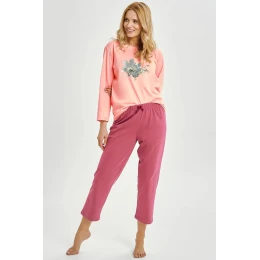 Pohodlné dámske pyžamo navrhnuté s ohľadom na každodenný relax. 7/8 tričko s polkruhovým výstrihom z mäkkého materiálu, zdobené módnou potlačou. Voľný strih poskytuje úplnú voľnosť pohybu a pohodlie pri nosení. 7/8 nohavice bez vreciek majú široký elastický pás a ozdobnú mašľu, ktorá celku dodáva šarm. Ľahký a príjemný materiál na dotyk zaručuje, že pyžamo bude skvelé na večerný relax aj pokojný spánok. Zabalené vo fóliovom vrecúšku, ideálne aj ako darček.