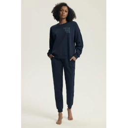 Elegantné a pohodlné dámske pyžamo s voľným a pohodlným strihom, ideálne na spanie a ako domáce oblečenie. Tričko s dlhými rukávmi, okrúhlym výstrihom a nápisom predstavuje moderný, uvoľnený štýl. Spustená línia ramien mu dodáva ľahký a každodenný charakter. Dlhé nohavice so vsadenými vreckami a manžetami zaručujú pohodlie a jednoduché nosenie. Rukávy sú tiež zakončené manžetami, čo zaručuje ideálne prispôsobenie. Pyžamo je balené v plastovom vrecku, takže je ideálne ako praktický darček.