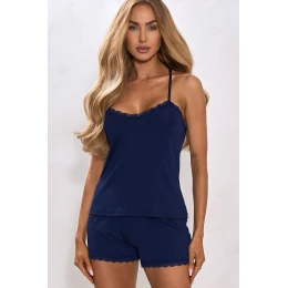 Modrá dámská pyžamo s ramínky a krátkými šortkami COMFY SIN je elegantní a neuvěřitelně pohodlný komplet navržený pro ženy, které chtějí spojit lehkost letní noční bielizny s ženským stylem. Hluboký odstín granátu dodává celku eleganci, zatímco jemná tkanina poskytuje příjemný pocit chladu a volnosti během spánku v teplejších nocích. Tričko s tenkými, nastavitelnými ramínky jemně zdůrazňuje ramena, zatímco efektní korzetový pruh na zádech představuje smyslný, přitažlivý akcent. Hladký přední díl doplněný jemnou krajkou u výstřihu udržuje rovnováhu mezi jednoduchostí a elegancí. Krátké šortky z měkkého, lehkého materiálu s krajkou na nohavičkách se krásně tvarují podle postavy a poskytují plný komfort nošení. Pyžamo COMFY SIN je harmonické spojení jednoduchosti, romantické elegance a pohodlí. Skvělé na letní večery a noci, umožňuje cítit se volně, žensky a výjimečně i v domácím prostředí. Každý model Pure