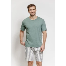 Pánsky pyžamový komplet pozostávajúci z trička s krátkym rukávom a krátkych nohavíc je ideálnou voľbou na teplé noci. Tričko má polkruhový výstrih, ktorý poskytuje pohodlie a voľnosť pohybu. Voľný, pohodlný strih zaručuje úplnú voľnosť pohybu a pohodlie počas spánku a odpočinku doma. Nohavice s efektnou potlačou dodávajú celému kompletu moderný charakter. Model nemá žiadne vrecká, čo zdôrazňuje jeho ľahkosť a pohodlie. Celý komplet sa dodáva v praktickom fóliovom vrecku, vďaka ktorému je výrobok dostatočne chránený počas prepravy a skladovania. Zloženie: 80% bavlna, 20% elastan Vrchný diel: 100% bavlna Spodný diel: 100% bavlna