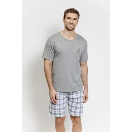 Mužský pyžamový set s tričkem s krátkým rukávem a krátkými kraťasy je skvělou volbou pro muže, kteří ocení pohodlí a volnost během spánku. Tričko s kulatým výstřihem poskytuje pohodlí a klasický, univerzální vzhled. Volný, pohodlný střih zaručuje plnou volnost pohybu, a měkká a prodyšná tkanina zase zajistí, že pyžamo bude skvěle fungovat i v teplejších nocích. Krátké kraťasy s potiskem dodávají celému setu moderní charakter. Model nemá kapsy, co zdůrazňuje jeho lehkost a pohodlí při nošení. Celý set je balený v fóliovém sáčku, který chrání výrobek a usnadňuje jeho skladování. Složení: Horní díl: 80% Bavlna, 20% Polyester Spodní díl: 100% Bavlna