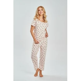 Dámský pyžamový set s krátkým rukávem je pohodlná sada, která kombinuje pohodlí se stylovým, jednoduchým střihem. Tričko s kulatým výstřihem je vyrobeno z měkké a prodyšné látky, která zajišťuje pohodlí při nošení a umožňuje pokožce dýchat během spánku. Dlouhé kalhoty s elastickým pásem zaručují pohodlné přizpůsobení postavy, a absence kapes zdůrazňuje lehkost a volný charakter modelu. Celý set je balen v fóliovém sáčku, který chrání pyžamo a usnadňuje jeho skladování.