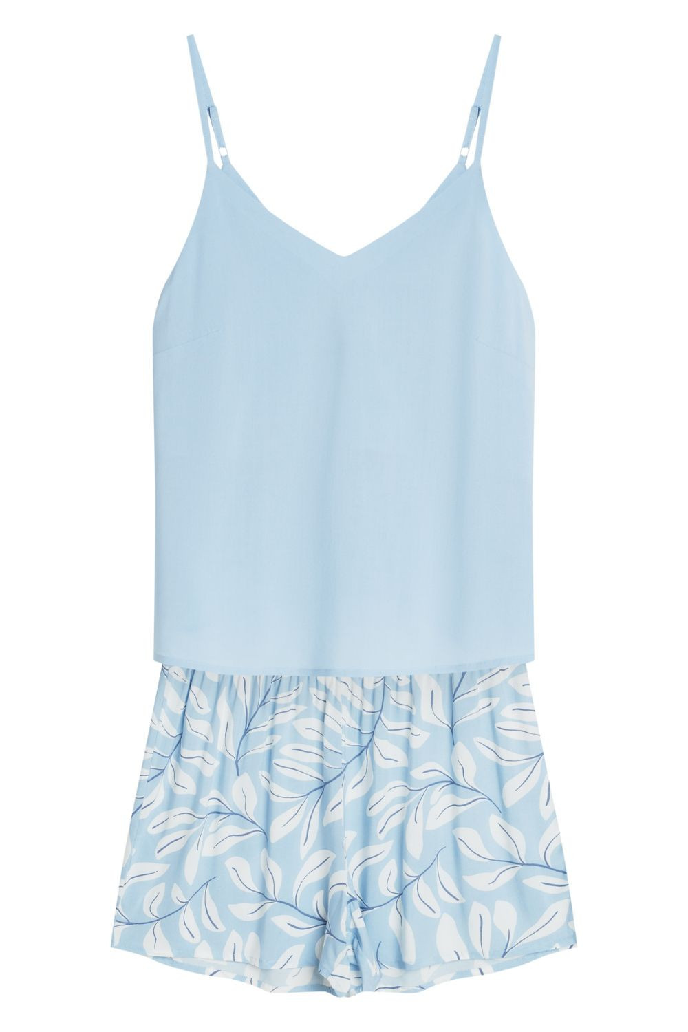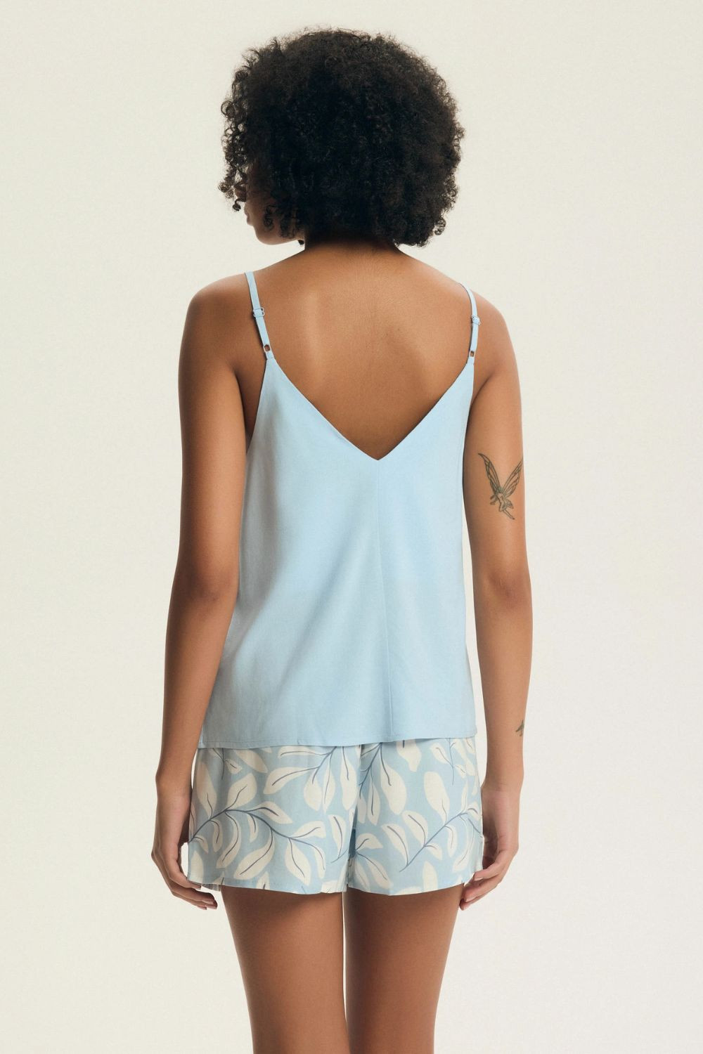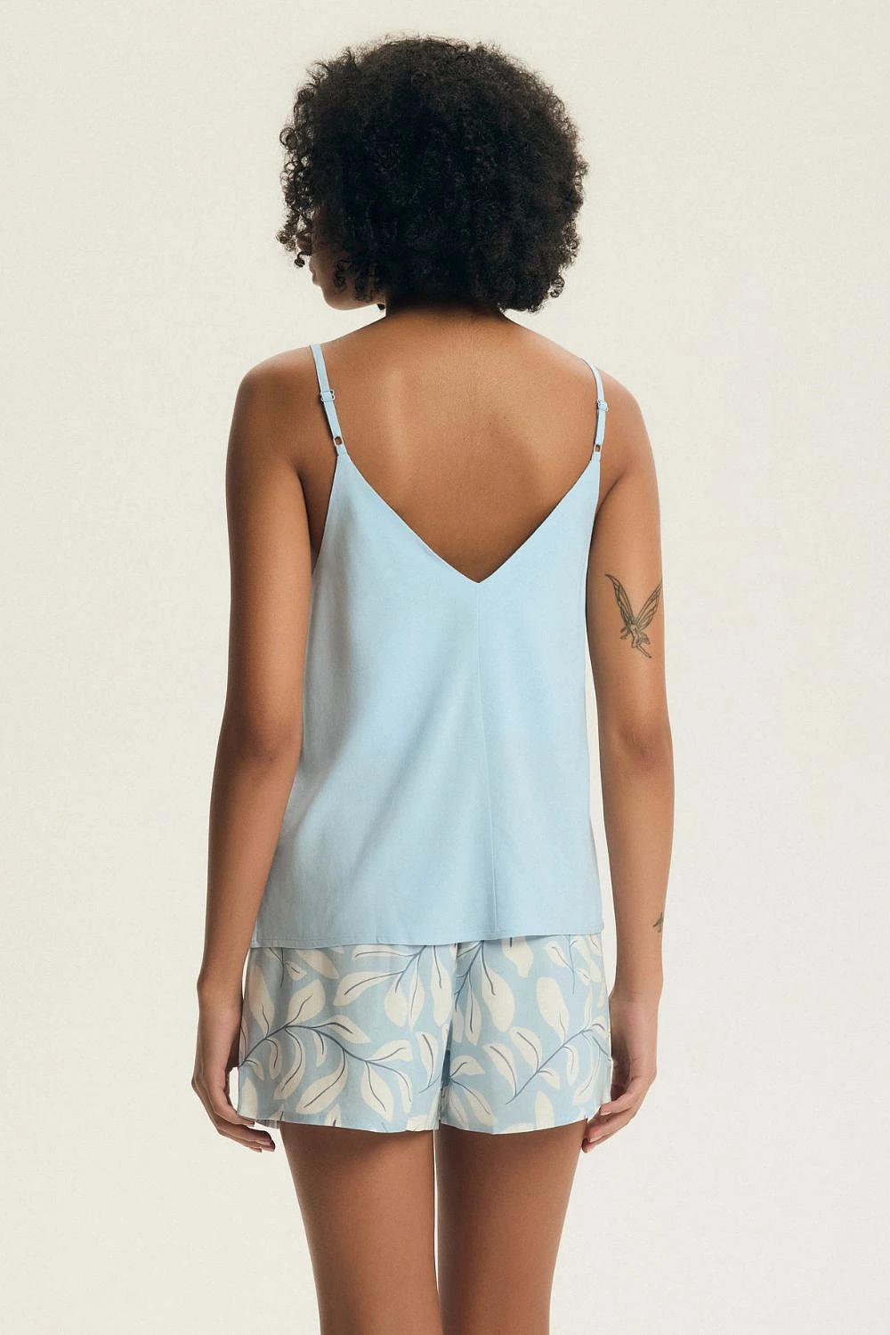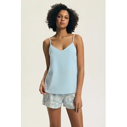Lehká a ženská dámská pyžama, navržená s ohledem na pohodlí při spaní a relaxaci doma. Souprava se skládá z košilky na nastavitelných ramínkách s V výstřihem, který zdůrazňuje ženskou siluetu a zároveň poskytuje volnost pohybu. Jemná, decentní barevnost dodává celku jemnou eleganci. K sadě jsou připojeny krátké volné kraťasy. V pase je široký gumový pás, který dobře sedí a zajišťuje pohodlí při nošení. Pyžamo je vyrobeno z měkkého a prodyšného materiálu, příjemného na pokožce, ideální na letní noci. Celá souprava je balena do praktického fóliového sáčku, což usnadňuje skladování a přepravu.