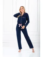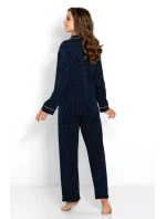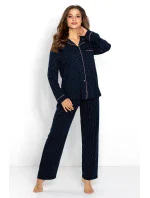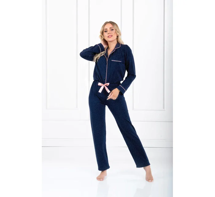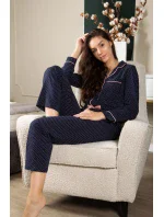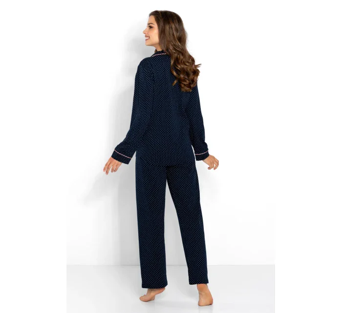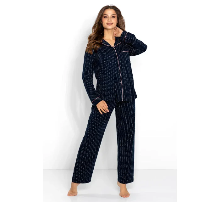 Pohodlné dvoudílné pyžamo, které vám propůjčí klasický vzhled. Je vyrobena z mimořádně měkké bavlny s prvotřídní povrchovou úpravou a umí se postarat o vaše pohodlí a luxusní odpočinek. Tkanina má správnou gramáž, takže perfektně sedí, méně se mačká a střih si bez problémů zachovává tvar. Elegantní límec, manžety rukávů a náprsní kapsa jsou zakončeny světle růžovým saténovým lemováním, takže celý model vypadá elegantně a stylově. Co je součástí sady? Halenka s dlouhými rukávy a zapínáním na knoflíky uprostřed. Volné, rovné kalhoty s dlouhými nohavicemi zakončené elastickým pasem a sladkou jasně růžovou mašlí. Model v námořnické barvě pokrytý jemným puntíkovaným potiskem. Polská značka Momenti Per Me. Složení: 92 % bavlna, 8 % elastan.