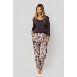 Objavte jedinečnú dámsku pyžamovú súpravu navrhnutú pre maximálne pohodlie a eleganciu. Mäkké, hladké viskózové tričko s 3/4 rukávmi jemne obopína telo, čím zabezpečuje voľnosť pohybu a príjemný pocit ľahkosti. Špicatý výstrih jemne zvýrazňuje dekolt a dodáva mu ženský nádych. Súpravu dopĺňajú dlhé bavlnené nohavice s praktickými vreckami, zdobené pútavou orientálnou potlačou, ktorá dodáva pyžamovej súprave jedinečný štýl. Je to ideálna súprava pre ženy, ktoré ocenia kombináciu pohodlia, kvality a módneho dizajnu. Celá súprava je balená v plastovom vrecku - ideálne aj ako darček.