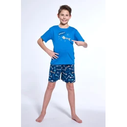 Młodzieżowa piżama Boy Young KR 790/120 Fishing to wygodna i stylowa propozycja dla chłopców ceniących komfort snu. Wykonana w 100% z wysokiej jakości bawełny, zapewnia przewiewność i miękkość, idealną na każdą noc. Koszulka z krótkim rękawem ma półokrągły dekolt i subtelny nadruk na piersi, nadający jej sportowego charakteru. Krótkie wzorzyste spodenki świetnie komponują się z jednolitą górą, a elastyczna gumka w pasie obszyta bawełną gwarantuje wygodne dopasowanie. To doskonały wybór zarówno na ciepłe noce, jak i do codziennego relaksu w domu.
