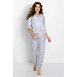 Tieto dámske pyžamá sú kombináciou pohodlia, elegancie a špičkového spracovania. Toto dvojdielne pyžamo je vyrobené zo 100 % bavlny a zaručuje nielen pohodlný spánok, ale aj príjemné nosenie. Košeľa so 7/8 rukávom dodáva celkovému vzhľadu moderný nádych. Manžety na koncoch rukávov dodávajú jemný nádych a podčiarkujú eleganciu a starostlivosť o spracovanie. Košeľa so zapínaním na gombíky umožňuje prispôsobiť strih vašim individuálnym preferenciám. Vďaka voľnému a pohodlnému strihu pyžamo dokonale prilieha k telu a umožňuje voľnosť pohybu. Ženský štýl je zdôraznený decentným a elegantným spôsobom, vďaka čomu je toto pyžamo vhodné nielen ako nočná bielizeň, ale aj ako dokonalý odev na relaxáciu doma. Dlhé nohavice s bočnými vreckami dodávajú pyžamu praktickosť a funkčnosť. Elastický pás zaručuje dokonalé prispôsobenie a uľahčuje obliekanie a vyzliekanie pyžama. Obzvlášť dôležitým prvkom je certifikát OEKO-TEX Standard 100, ktorý potvrdzuje, že použité materiály sú bezpečné pre pokožku a životné prostredie. Kvalitná potlač látky dodáva pyžamu jedinečný charakter. Tieto pyžamá, navrhnuté a vyrobené v Poľsku, predstavujú poľskú krajčírsku precíznosť a zmysel pre detail. Dvojdielna súprava je ideálnym darčekom pre každú ženu, ktorá oceňuje pohodlie, eleganciu a kvalitu.