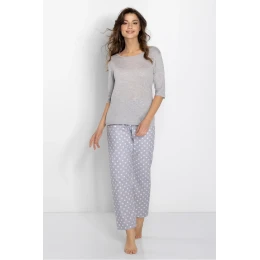 Pozývame vás objavovať jedinečné dámske pyžamá, ktoré spájajú jedinečné pohodlie a jemný pôvab. Táto dvojzložková kompozícia bola vytvorená pre ženy, ktoré sa chcú cítiť výnimočne počas spánku aj vo chvíľach odpočinku. Táto blúzka s 3/4 rukávmi a výstrihom do U vás poteší svojou jemnosťou a ženskou eleganciou. Výstrih bol tiež olemovaný lemom, ktorý celku dodáva jemnosť. Jemné farby pyžama podčiarkujú jeho ľahkosť a šarm. Pyžamový top má voľný strih, vďaka ktorému sa veľmi pohodlne nosí. Dlhé nohavice s elastickým pásom zaručujú voľnosť pohybu a perfektne sedia. Tieto pyžamá majú nielen úžasný dizajn, ale boli vytvorené s ohľadom na bezpečnosť a pohodlie. Má certifikát OEKO-TEX Standard 100, ktorý potvrdzuje, že použité materiály neobsahujú látky škodlivé pre pokožku. Mäkká a vzdušná tkanina sa navyše po praní nedeformuje a nespôsobuje podráždenie. Poľský výrobok je navrhnutý a ušitý s dôrazom na najmenšie detaily a predstavuje vysokú kvalitu spracovania. Dvojdielna súprava je nielen dokonalým oblečením na večernú prechádzku, ale aj perfektným darčekom pre každú ženu, ktorá oceňuje pohodlie a eleganciu.