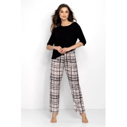 Elegantné dámske pyžamo, ideálne aj ako darček. Blúzka s 3/4 rukávmi a výstrihom do U zaujme štýlovým oversized strihom pre pohodlie a voľnosť pohybu. Voľný vrchný diel ladí s pohodlným strihom dlhých nohavíc, ktoré majú elastický pás zaručujúci pohodlie počas spánku. Pyžamo je vyrobené z mäkkej viskózy a elegantného saténu, vďaka čomu je jemné na dotyk a elegantné. Kvalitná potlač na nohaviciach dodáva pyžamu osobitý šarm. Toto dvojdielne pyžamo, navrhnuté a ušité v Poľsku, je synonymom pohodlia a elegancie. Zloženie: Vrchný diel: 92% viskóza, 8% elastan Spodný diel: 100% polyester