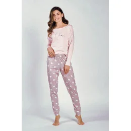 Dámske pyžamo ideálne na každý večer aj na domáce nosenie. Blúzka s dlhými rukávmi v jemných farbách má polkruhový výstrih a nápisy, ktoré jej dodávajú jemný šarm. Je vyrobená z mäkkej a vzdušnej tkaniny a poskytuje pohodlné nosenie. Dlhé nohavice s elastickým pásom sa dokonale prispôsobia postave a poskytujú voľnosť pohybu. Celá súprava je zabalená v praktickom vrecúšku, takže je ideálna ako darček. Toto pyžamo, navrhnuté a ušité v Poľsku, spája vysokú kvalitu a výnimočný štýl.