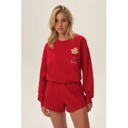Dámske pyžamo z mäkkej, hladkej bavlny s vnútornou výplňou. Blúzka s dlhými rukávmi a okrúhlym výstrihom, zdobená vreckom a prvkom s motívom dovolenky. Súčasťou sú krátke šortky. Spodná časť blúzky a rukávy ukončené lemovaním.