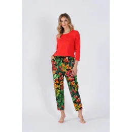 Dámsky pyžamový komplet spájajúci pohodlie a štýl. 7/8 rukávové tričko s mäkkým polkruhovým výstrihom je vyrobené z hladkej a príjemnej tkaniny. Voľný, pohodlný strih zaručuje pohodlie a voľnosť pohybu a prídavné vrecká dodávajú funkčnosť a šarm. 7/8 nohavice sú zdobené modernou potlačou a zakončené elastickým pásom, ktorý zaručuje ideálne prispôsobenie. Celkovo ide o kombináciu elegancie a pohodlia, ideálnu na relaxačný večer alebo pokojný deň doma. Zloženie: Vrchná časť: 100% bavlna Spodná časť: 94% viskóza, 6% elastan
