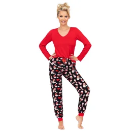Dámska vianočná pyžamová súprava, ktorá je vhodná na spanie aj ako pohodlný domáci odev na zimné dni. Tričko s dlhým rukávom a výstrihom do V poskytuje pohodlie a jemne zvýrazňuje dekolt. Je vyrobené z mäkkej, priedušnej tkaniny, ktorá umožňuje pokožke dýchať a zaručuje maximálne pohodlie pri nosení. Dlhé nohavice zdobené vianočnou potlačou majú elastický pás a jemnú mašľu v páse, vďaka čomu dobre sedia na postave. Nohavice sú bez vreciek, čo zdôrazňuje ich ľahký, minimalistický štýl. Celá súprava bola navrhnutá a vyrobená v Poľsku, čo svedčí o vysokej kvalite spracovania a pozornosti venovanej detailom.