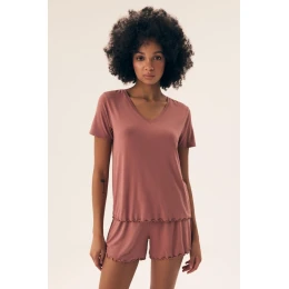 Elegantné dámske pyžamo z mäkkej viskózy zaručuje pohodlný spánok. Tričko s krátkymi rukávmi a výstrihom do V, ktoré v spodnej časti zdobí jemná čipka, sa skvele hodí ku krátkym nohaviciam, ktoré majú široký elastický pás pre ešte väčšie pohodlie. Hladký materiál zaručuje príjemný pocit, ideálny na teplé noci. Výrobok je zabalený v praktickom fóliovom vrecúšku, skvelom aj ako darček.