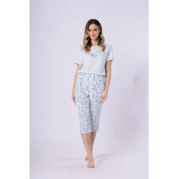 Toto roztomilé dámske pyžamo je dokonalou kombináciou pohodlia a módneho dizajnu. Polopriehľadné tričko s krátkymi rukávmi má jemnú potlač, ktorá mu dodáva charakter. Trojštvrťové nohavice majú tiež potlač, zatiaľ čo elastický pás a ozdobná mašľa zaručujú dokonalé prispôsobenie a dievčenský šarm. Celý kúsok je zabalený v praktickom fóliovom vrecúšku, takže je skvelým darčekom.