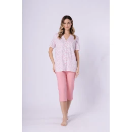 Táto štýlová dámska pyžamová súprava spája pohodlie s funkčnosťou. Tričko s krátkymi rukávmi a voľným strihom zdobí módna potlač a praktické vrecká na bokoch dodávajú každodenné pohodlie. 3/4 nohavice s elastickým pásom zaručujú voľnosť pohybu. Košeľa so zapínaním na gombíky navyše umožňuje rýchle a jednoduché prispôsobenie. Celá súprava je zabalená v plastovom vrecku, takže je ideálnou voľbou aj ako darček.