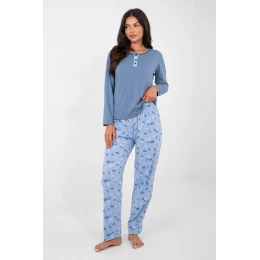 Pohodlné dámske pyžamo pozostávajúce z trička jednofarebného strihu a nohavíc s jemným kvetinovým vzorom. Je vyrobené z kvalitnej bavlny, ktorá je mäkká, priedušná a príjemná na pokožku, ideálna na celonočné nosenie. Tričko s dlhými rukávmi, okrúhlym výstrihom a zapínaním na tri gombíky spája pohodlie s klasickým vzhľadom. Nohavice s rovnými nohavicami zabezpečujú voľnosť pohybu a vysoký pás zvyšuje pohodlie pri nosení. Vďaka chýbajúcim vreckám je celkový dojem ľahký a upravený.