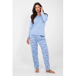 Tento pohodlný dámsky pyžamový komplet pozostáva z trička v jednofarebnom prevedení a nohavíc s jemným kvetinovým vzorom. Je vyrobený z kvalitnej bavlny, ktorá je mäkká, priedušná a príjemná na pokožku, ideálna na celonočné nosenie. Tričko s dlhými rukávmi a okrúhlym výstrihom zapínané na tri gombíky spája pohodlie s klasickým vzhľadom. Nohavice s rovnými nohavicami poskytujú voľnosť pohybu a vysoký pás zvyšuje pohodlie pri nosení. Bez vreciek, celkový vzhľad je ľahký a upravený.
