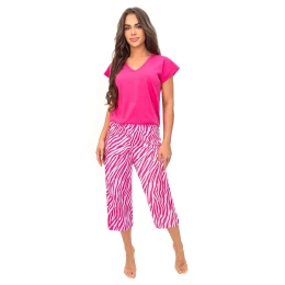 Pohodlné a štýlové dámske pyžamo, ktoré spája pohodlie s moderným vzhľadom. Tričko s krátkymi rukávmi a výstrihom do V poskytuje ľahkosť a voľnosť pohybu, pričom pôsobí žensky a elegantne. 3/4 nohavice s potlačou dotvárajú celkový vzhľad, pričom absencia vreciek a elastický pás zaručujú pohodlie pri nosení a ideálne prispôsobenie sa postave. Celý kúsok je vyrobený z mäkkého a priedušného materiálu, príjemného na pokožku, vďaka čomu pyžamo zaručuje pohodlný spánok. Výrobok je zabalený v praktickom fóliovom vrecúšku, vďaka čomu sa skvele hodí aj ako darček.
