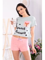 Sladký a sexy! Tento dvojdielny dámsky pyžamový set je jednoducho sladký. Blúzka je krátke tričko v sivej farbe s potlačou líšky na vrecku a nápisom "Sweet dreams" na prednej strane. Šortky v ružovej farbe s jemnou potlačou a mašľou v páse sú klasickou, veľmi dobrou voľbou. 100 % bavlna.