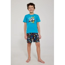 Chlapčenské pyžamo YOUNG KR 790/123 ROAD TRIP je pohodlná a štýlová súprava nočného oblečenia, ktorá je ideálna na teplejšie dni. Je vyrobené zo 100 % kvalitnej bavlny, je mäkké, priedušné a šetrné k jemnej pokožke vášho dieťaťa. Tričko s krátkym rukávom zdobí módna potlač na hrudi, ktorá dodáva pyžamu mladistvý, dynamický charakter. Súčasťou súpravy sú krátke vzorované šortky, ktoré zabezpečujú voľnosť pohybu a pohodlie pri spánku. Pyžamo je zabalené v estetickej škatuli, vďaka čomu je ideálne ako darček.