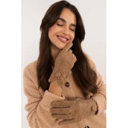 Elegantné dámske rukavice zo zateplenej hladkej tkaniny. Ozdobný gombík a rozparok na zápästí. Ukazovák s vyšívaným kvetom, ktorý umožňuje ovládať telefón bez nutnosti vyzliecť si rukavice.