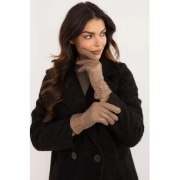 Elegantné dámske rukavice z hrejivého materiálu v kombinácii s ekologickou kožou. Ozdobné gombíky na zápästí. Ukazovák s vyšitým kvetom umožňuje ovládať telefón bez toho, aby ste si museli vyzliecť rukavice.