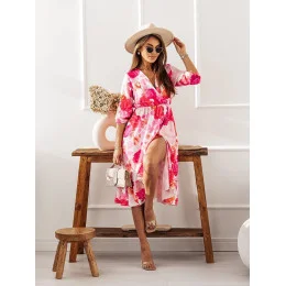 Šaty majú skladaný obálkový výstrih a elastický pás. Rukávy s 3/4 dĺžkou sú olemované gumou. V spodnej časti modelu je štrbina.
