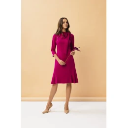 65% polyester 30% viskóza 5% elastan DETAILY VÝROBKU: šaty z tkanej látky so stojačikom a viazaním 3/4 rukávy dĺžka po kolená volánový lem bez podšívky skrytý zips na chrbte Naša modelka meria 174 cm a nosí veľkosť S navrhnuté a vyrobené v Poľsku