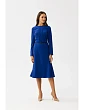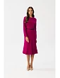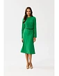 65% polyester 30% viskóza 5% elastan PODROBNOSTI O PRODUKTE: šaty z tkanej látky s ozdobnými vertikálnymi záhybmi vpredu dlhé rukávy opasok s prackou opasok z umelej kože dĺžka pod kolená a šikmý strih sukne bez podšívky skrytý zips vzadu naša modelka je vysoká 174 cm a nosí veľkosť S navrhnuté a vyrobené v Poľsku