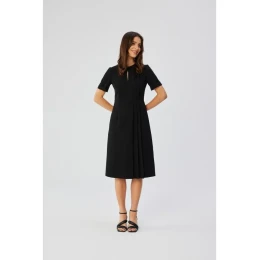 65% polyester 30% viskóza 5% elastan PODROBNOSTI O PRODUKTE: tkané šaty s ozdobnými záhybmi na bokoch výstrih s kľúčovou dierkou krátke rukávy so záhybom pod kolenom skrytý zadný zips bez podšívky naša modelka je vysoká 176 cm a nosí veľkosť S navrhnuté a vyrobené v Poľsku