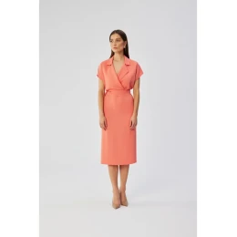 95% polyester 5% elastan DETAILY VÝROBKU: košeľové šaty z tkanej látky s golierom zavinovací vrch s krátkymi netopierími rukávmi ceruzková sukňa stredná dĺžka čiastočne elastický pás dĺžka pod kolená rozparky na chrbte nepodšitý opasok na zaväzovanie naša modelka je vysoká 176 cm a nosí veľkosť S navrhnuté a vyrobené v Poľsku