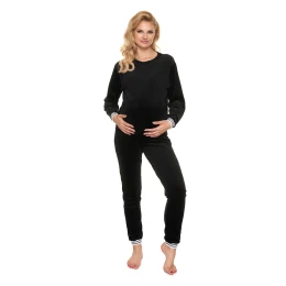 Tepláková súprava s kontrastným lemovaním. Blúzka s okrúhlym výstrihom. Mikina je vyrobená z mäkkej velúrovej tkaniny. Nohavice s netlačiacim pásikom.