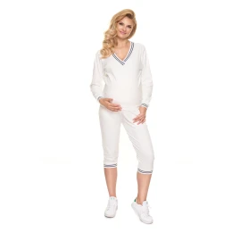 Tepláková súprava s kontrastným lemovaním. Blúzka s výstrihom do V. Mikina je vyrobená z mäkkej velúrovej tkaniny. Nohavice v 3/4 dĺžke s netlačiacim pásikom.