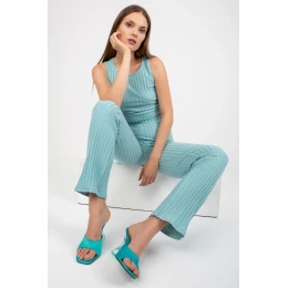 Súbor sa skladá z topu a dlhých nohavíc. Krátky top s okrúhlym výstrihom. Dlhé nohavice s vysokým sedom a rovnými nohavicami, elastický pás. Súbor je vyrobený zo širokej rebrovanej tkaniny.