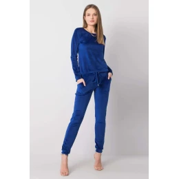 Velúrová súprava pozostávajúca z blúzky a nohavíc. Blúzka s dlhými rukávmi a okrúhlym výstrihom. Dlhé nohavice so zaväzovaním v páse a nakladanými vreckami.