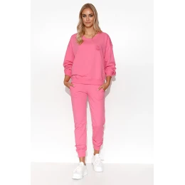 Dámska tepláková súprava vyrobená z ľahkého úpletu. Jednoduchá dámska tepláková súprava sa oblieka cez hlavu. Má dlhé rukávy ukončené rebrovaním, ktoré je aj vo výstrihu a v spodnej časti teplákovej súpravy. Na prednej strane je našitá aplikácia s písmenom M. Okrúhly výstrih jemne odhaľuje kľúčne kosti. Klasická dámska tepláková súprava s dlhými nohavicami a bočnými nápletovými vreckami. Nohavice sú ukončené rebrovanými manžetami. V páse majú hrubú šnúrku. Vďaka nej nohavice nestekajú a dokonale sedia na postave. bavlna 95 %Elastan 5 %