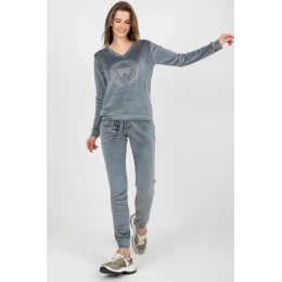 Velúrová súprava pozostávajúca z blúzky a nohavíc. Blúzka s dlhými rukávmi a serpentínami. Dlhé nohavice so zaväzovaním v páse a nakladanými vreckami.