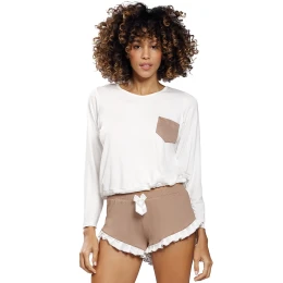 Viskózová súprava Ronnie sa skladá z blúzky svetlej farby s dlhými rukávmi a hnedým vreckom a šortiek s volánikom. Celkový vzhľad je jemný a dievčenské. Spodná časť košieľky je nastaviteľná pomocou saténovej stuhy. Košieľka sa dodáva vo voľnejšej verzii v každej veľkosti. Dodajte svojmu šatníku na nočnú bielizeň nádych luxusu s našou viskózovou súpravou. Zdobí ju jemný volánik, takže je ideálny pre zvláštne príležitosti alebo len pre pohodový večer doma. Tento komplet je vyrobený z vysoko kvalitnej viskózy, je mäkký a pohodlný na nosenie po celú noc.