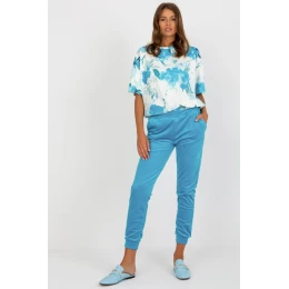 Velúrová súprava pozostávajúca z blúzky a nohavíc. Blúzka s krátkymi rukávmi a okrúhlym výstrihom. Blúzka z látky so zaujímavým vzorom. Dlhé nohavice s vysokým pásom a nakladanými vreckami na bokoch.