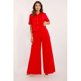 Elegantná a pohodlná súprava, ktorá dokonale spája ležérny štýl s nádychom elegancie. Je vyrobená z ľahkej a priedušnej viskózy a poskytuje celodenné pohodlie, ideálne na každodenné nosenie a do práce. Košeľa klasického strihu má krátke rukávy, golier a zapínanie na gombíky, čo jej dodáva nadčasový charakter. Široké nohavice s vysokým pásom krásne zvýrazňujú postavu a skrytý zips na boku zaručuje estetické zakončenie a pohodlné nosenie. Bočné vrecká na náprsnej strane dodávajú súprave funkčnosť a uvoľnený charakter. Hladký vzor a minimalistický dizajn umožňujú ľahko kombinovať súpravu s rôznymi doplnkami a vytvoriť tak štýlový outfit na rôzne príležitosti. Ideálna voľba pre ženy, ktoré oceňujú pohodlie a nadčasový štýl!