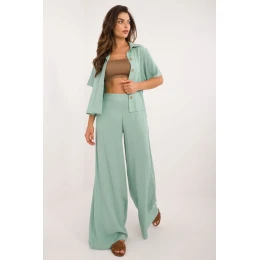 Elegantná a pohodlná súprava, ktorá dokonale spája ležérny štýl s nádychom elegancie. Je vyrobená z ľahkej a priedušnej viskózy a poskytuje celodenné pohodlie, ideálne na každodenný život a do práce. Košeľa klasického strihu má krátke rukávy, golier a zapínanie na gombíky, čo jej dodáva nadčasový charakter. Široké nohavice s vysokým pásom krásne zvýrazňujú postavu a skrytý zips na boku zaisťuje estetické prevedenie a pohodlné nosenie. Vložené bočné vrecká dodávajú funkčnosť a uvoľnený charakter. Hladký vzor a minimalistický dizajn umožňujú jednoduché kombinovanie s rôznymi doplnkami, čím sa vytvárajú stylingy na rôzne príležitosti. Ideálna voľba pre ženy, ktoré oceňujú pohodlie a nadčasový štýl!