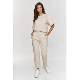 Tento pohodlný dresový set je ideální nabídkou pro každodenní stylizace a aktivní odpočinek. Má volný top s kulatým výstřihem zakončeným jemným lemováním a raglánovými rukávy, které jsou skvělé pro ty, kteří chtějí upravit linii ramen. Klasické kalhoty s přímými nohavicemi mají gumový pas, který umožňuje přizpůsobit se postavě a velké nášité kapsy přidávají stylový akcent a funkčnost. Tato kombinace oblečení vytváří harmonický a pohodlný celek. Jednoduchý a volný střih tohoto setu z něj činí nadčasový a univerzální, zachovávající přitom svobodu a módní vzhled. Dresový set je vyroben z prodyšného bavlněného materiálu, který ho činí praktickým i během teplejších dnů. Tento set se skvěle hodí na každodenní vycházky, nákupy, setkání s přáteli nebo jiné fyzické aktivity. Tento dres je spojením funkčnosti a stylu, ideální pro ty, kteří chtějí být pohodlně, aniž by ztratili módní vzhled.